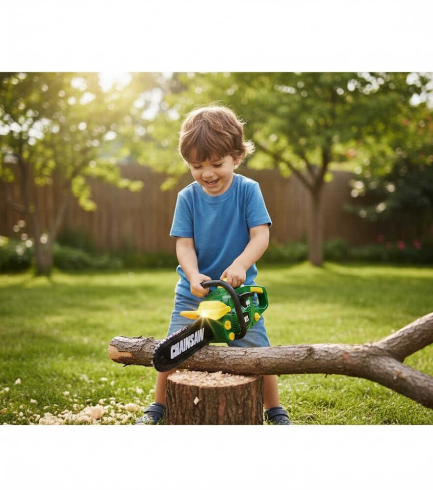 При натискане на бутона се активират звукови ефекти, наподобяващи звука на работеща моторна резачка, което прави преживяването още по-вълнуващо. В същото време веригата започва да се върти, създавайки впечатление, че играчката наистина реже.