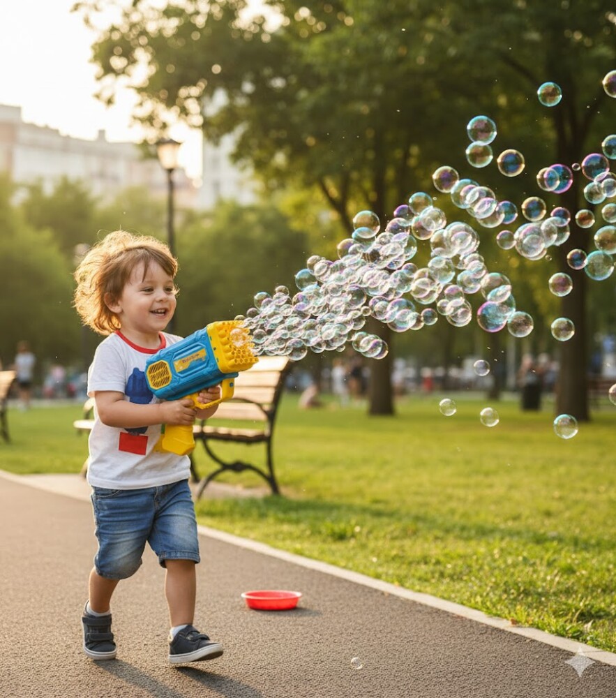 Превърнете всеки ден в истински празник с нашия автоматичен пистолет за сапунени мехурчета със светлинни ефекти! Тази забавна играчка генерира хиляди феерични мехурчета само с едно натискане на спусъка, а вградените светлини правят играта още по-магична, дори и по здрач.